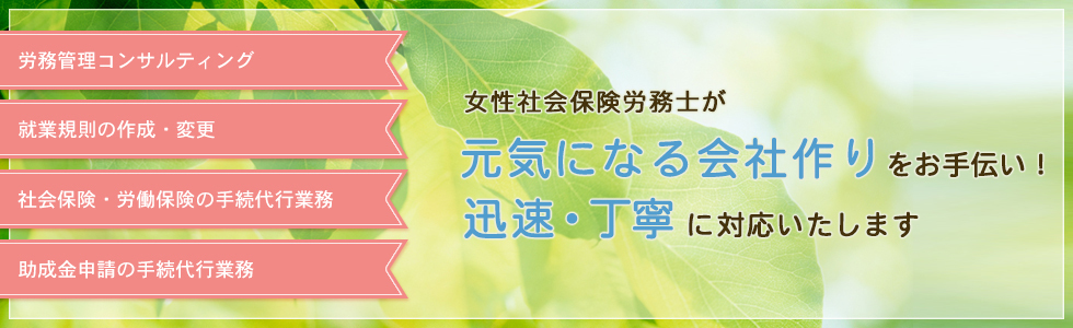 松和ひまわり社労士事務所では、労務管理のご相談や就業規則の作成・変更をはじめ、社会保険・労働保険の手続代行業務、給与計算、助成金申請等を行っています。
